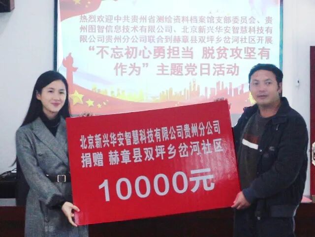 本次扶贫活动,张锦同志代表新兴华安贵州分公司全体员工向赫章县双坪乡岔河社区捐赠人民币1万元,用于助力群众生活改善、教育扶持等与社区生活息息相关的方方面面。